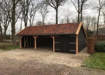 Met een ruime afmeting van 6,5 x 9 meter biedt deze kapschuur volop opslagmogelijkheden en een sfeervolle overkapping.